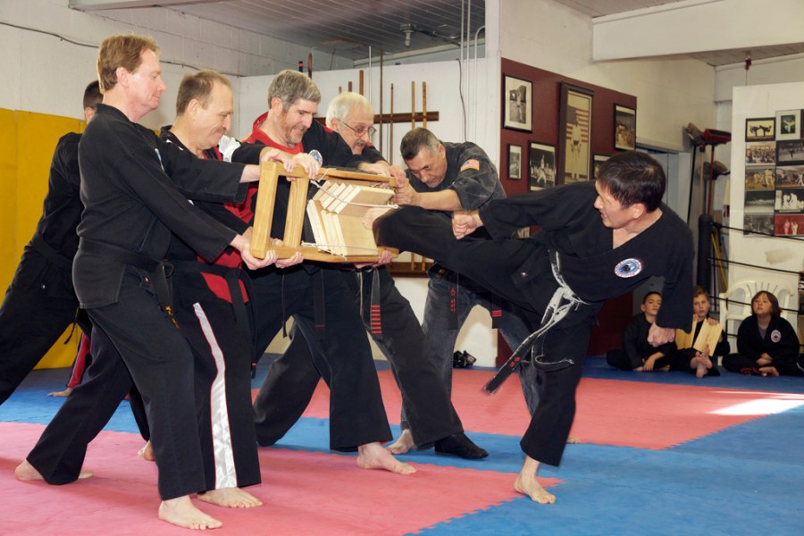 Master Kim breaking with a back kick.